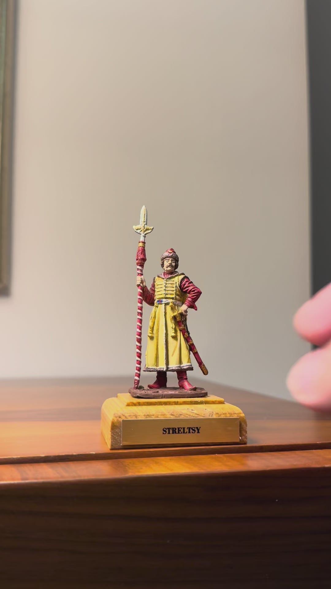 This miniature represents a member of the Streltsy (Стрельцы), the elite infantry units of the Tsardom of Russia in the 17th century. Known for guarding Moscow and the Kremlin, the Streltsy were recognized by their distinct uniforms, long firearms, and proud military tradition.