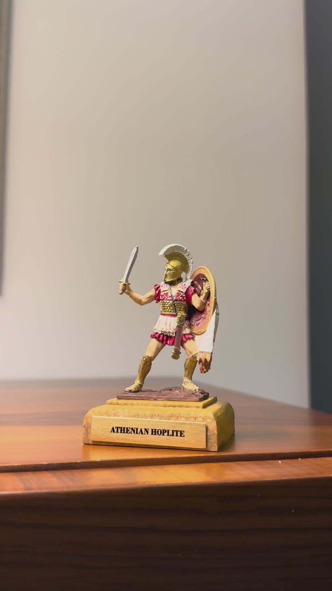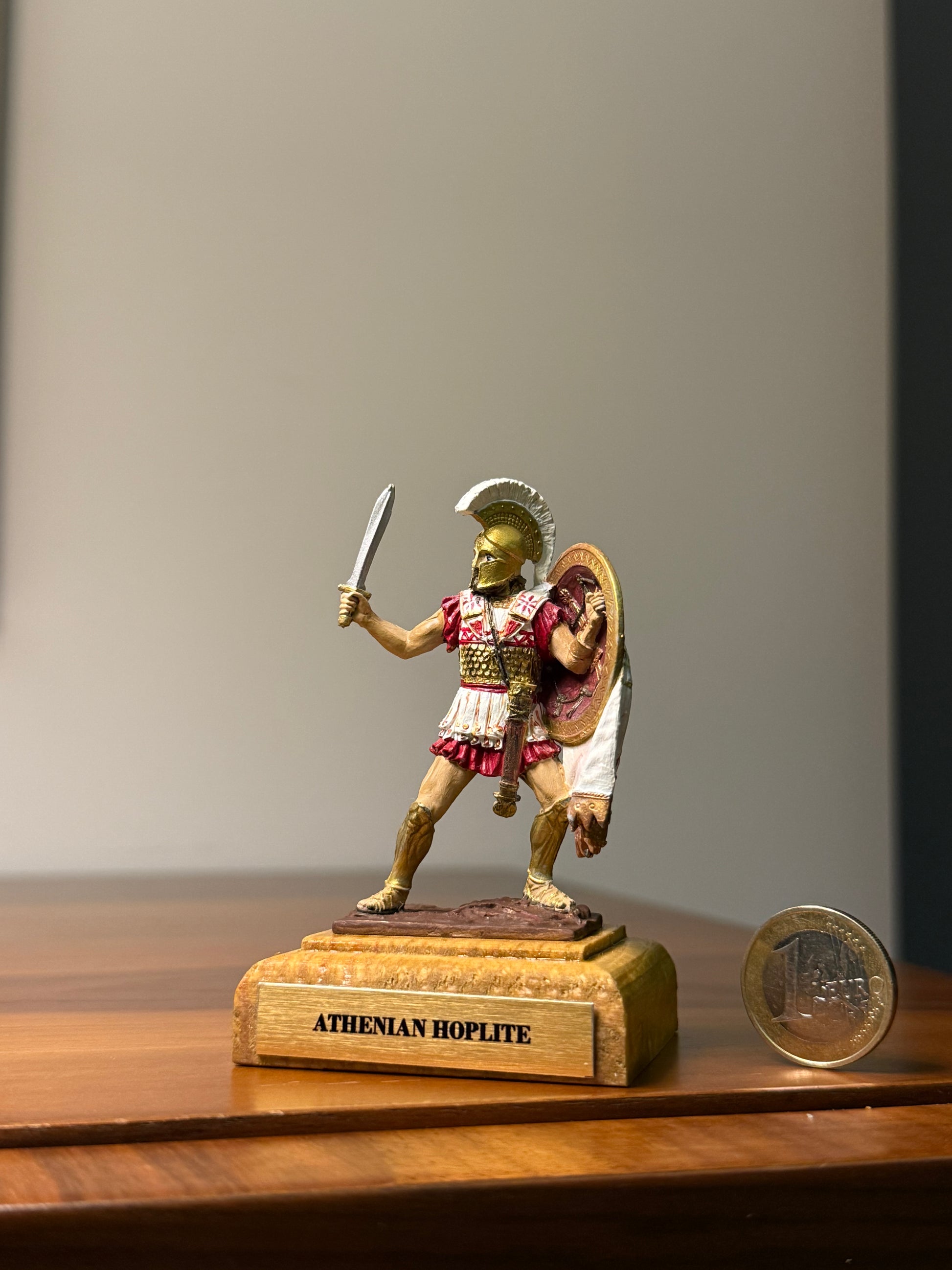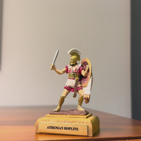 This miniature depicts an Athenian hoplite of the 5th century BCE — a heavily armed citizen-soldier of Classical Greece. Hoplites fought in the iconic phalanx formation, advancing in disciplined ranks behind broad bronze shields while wielding long spears and short swords in close combat.