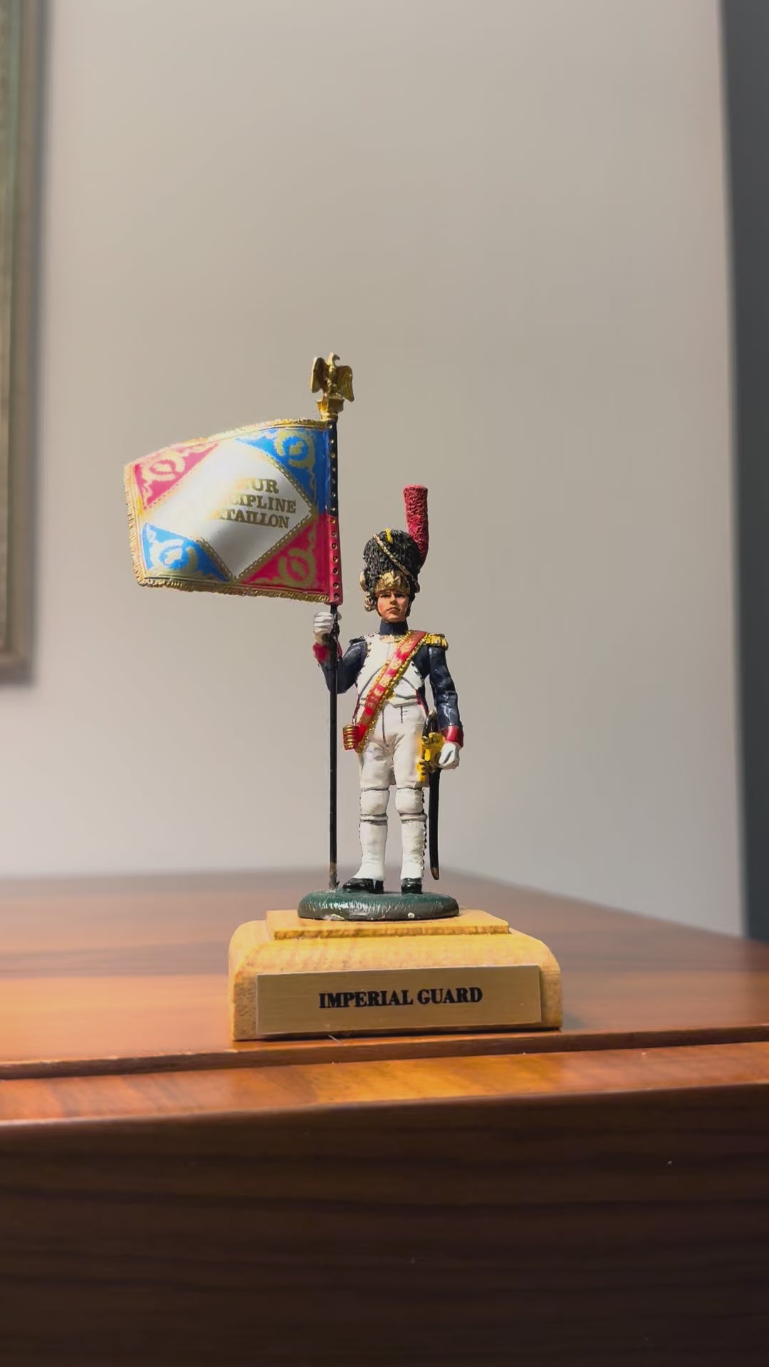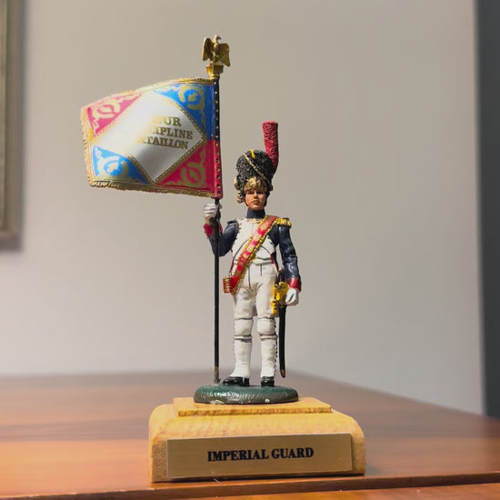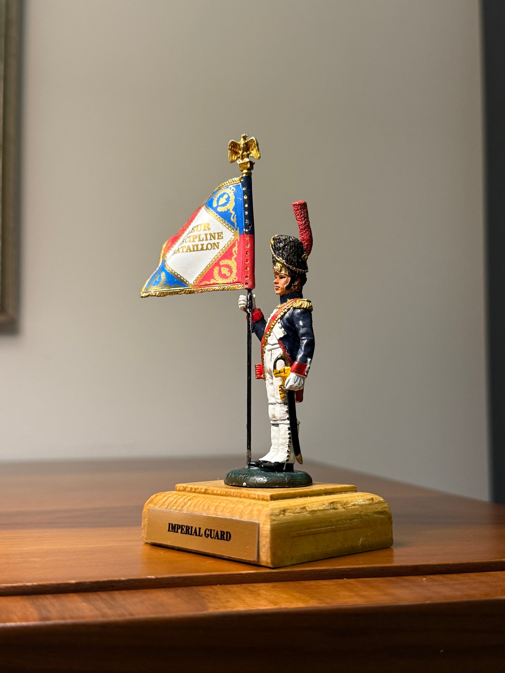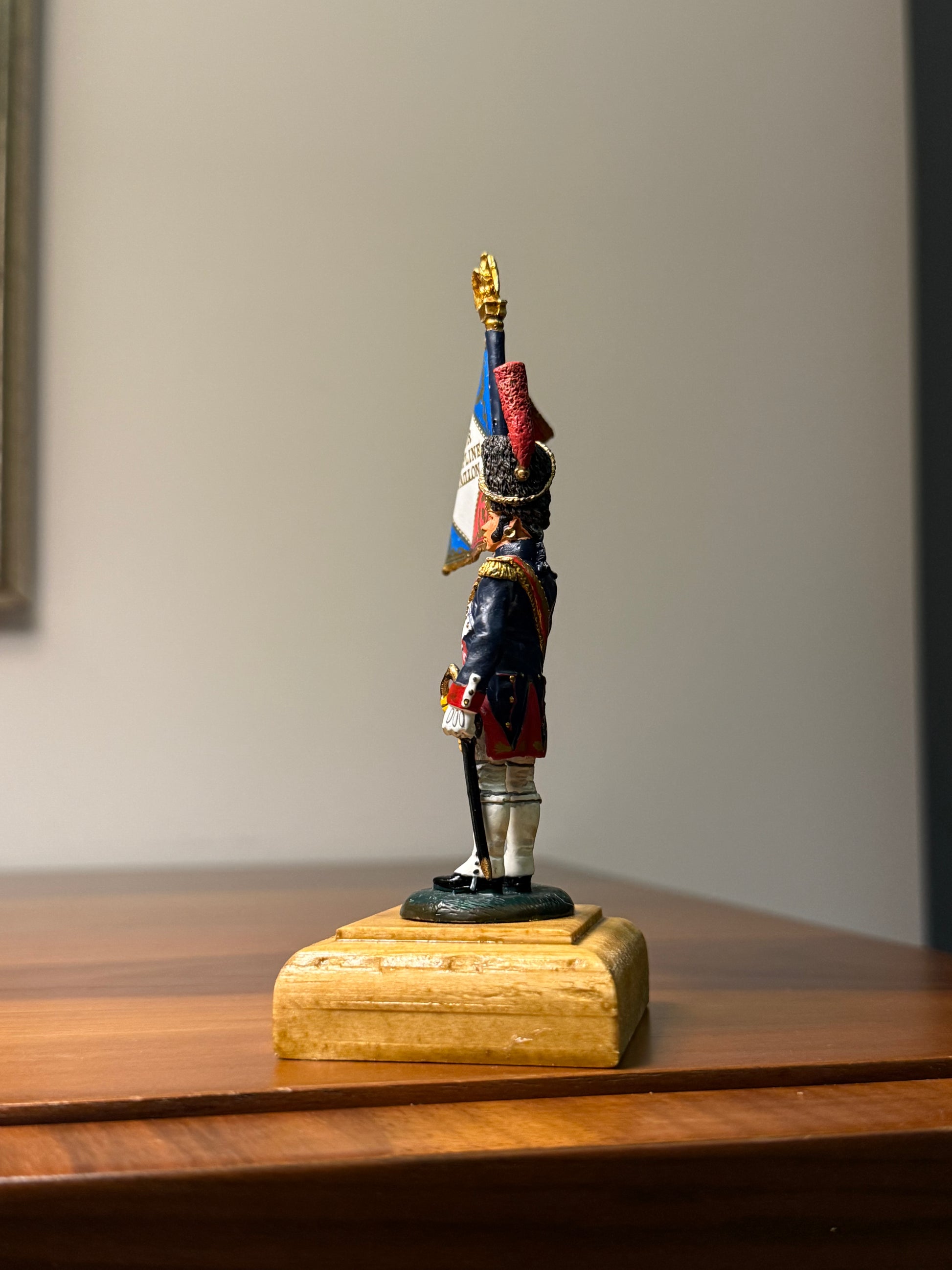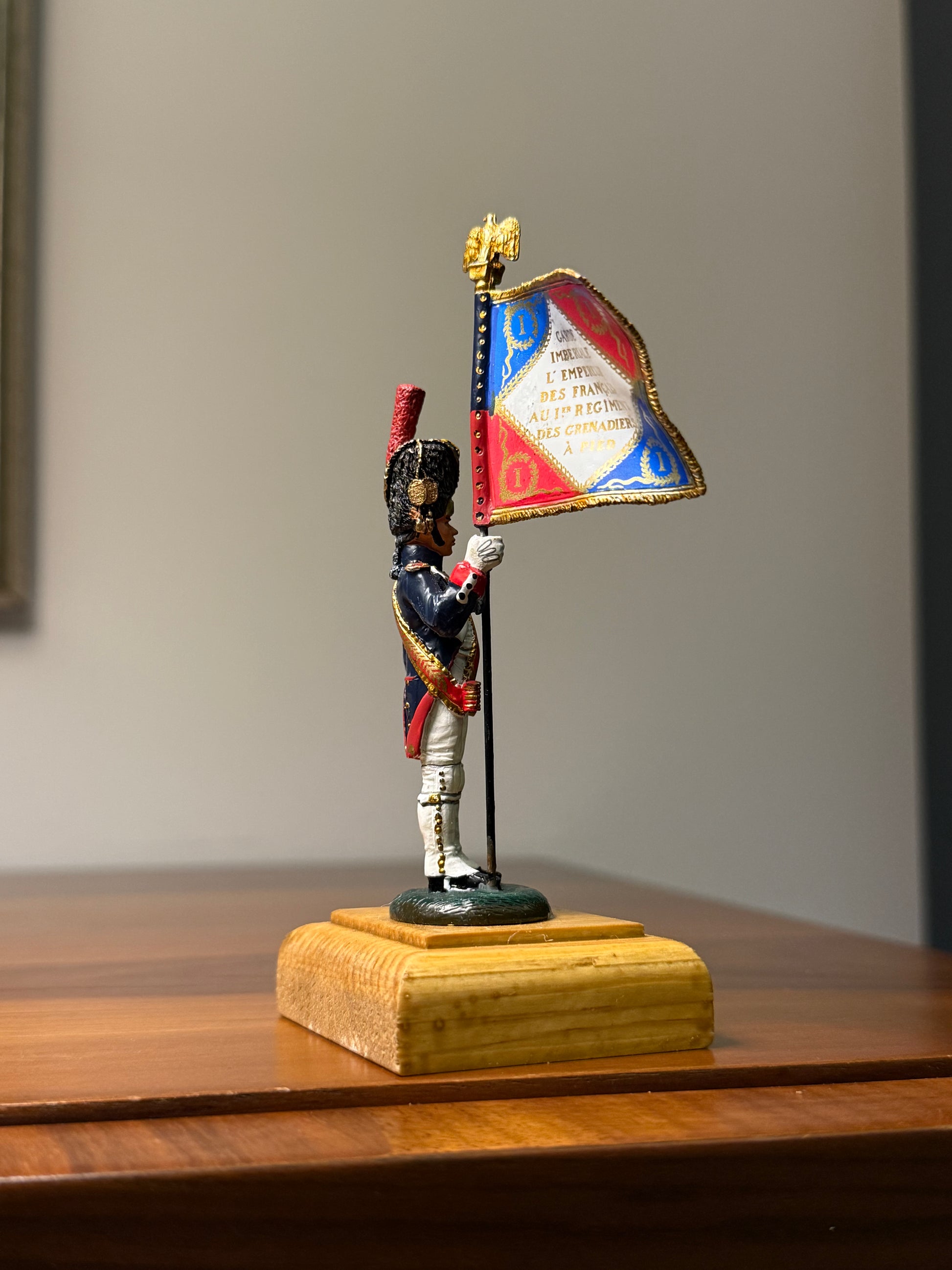 This 54 mm miniature represents a soldier of the Grenadiers à Pied of the Imperial Guard, the elite infantry corps of Napoleon Bonaparte during the Napoleonic Wars (1803–1815).