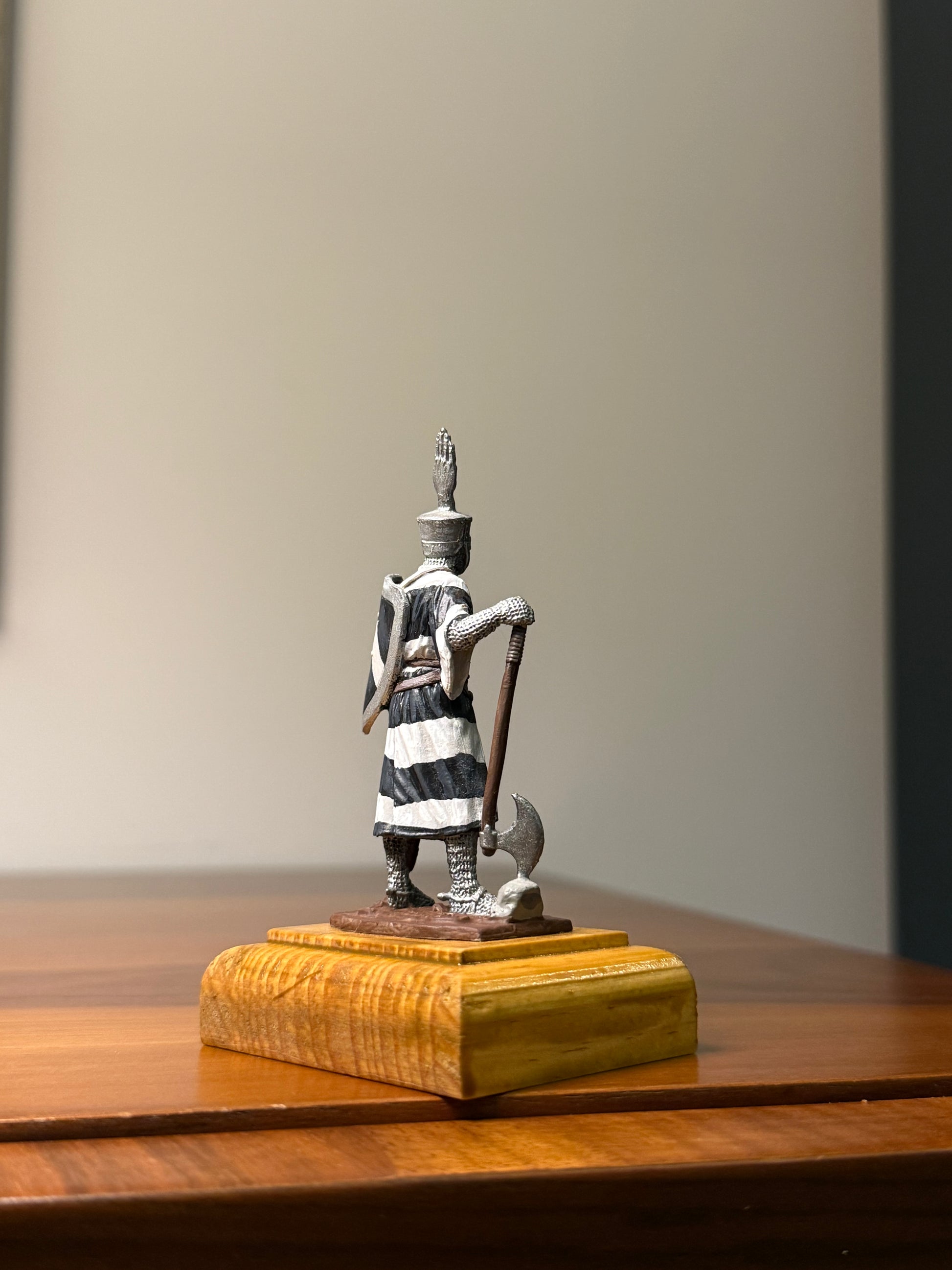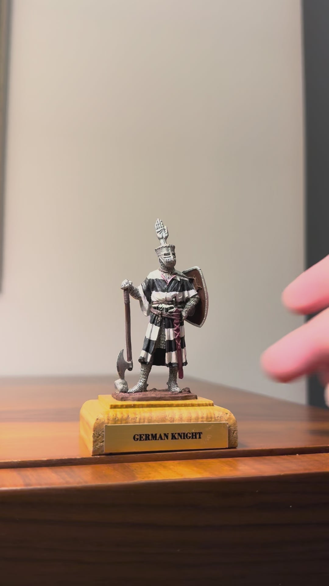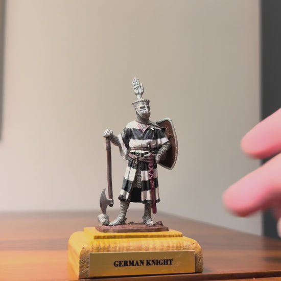 This miniature represents a German knight of the 14th century, during a period when European armor evolved into highly articulated plate harnesses designed for both battlefield use and tournament combat. Knights of this era served as elite cavalry or commanding infantry, symbolizing martial honor, noble lineage, and the chivalric order of medieval Europe.
