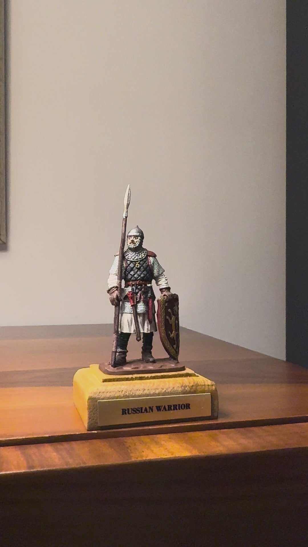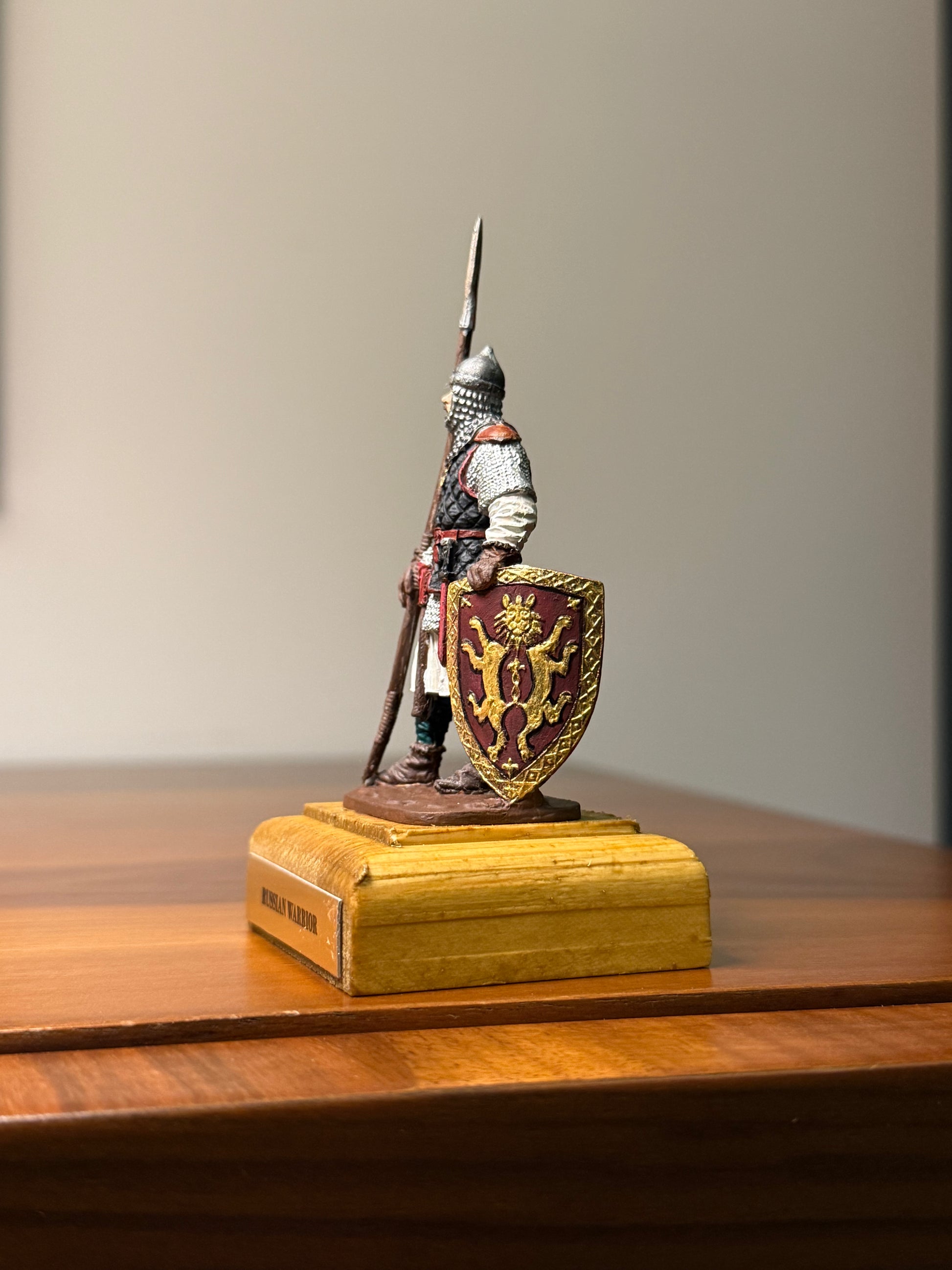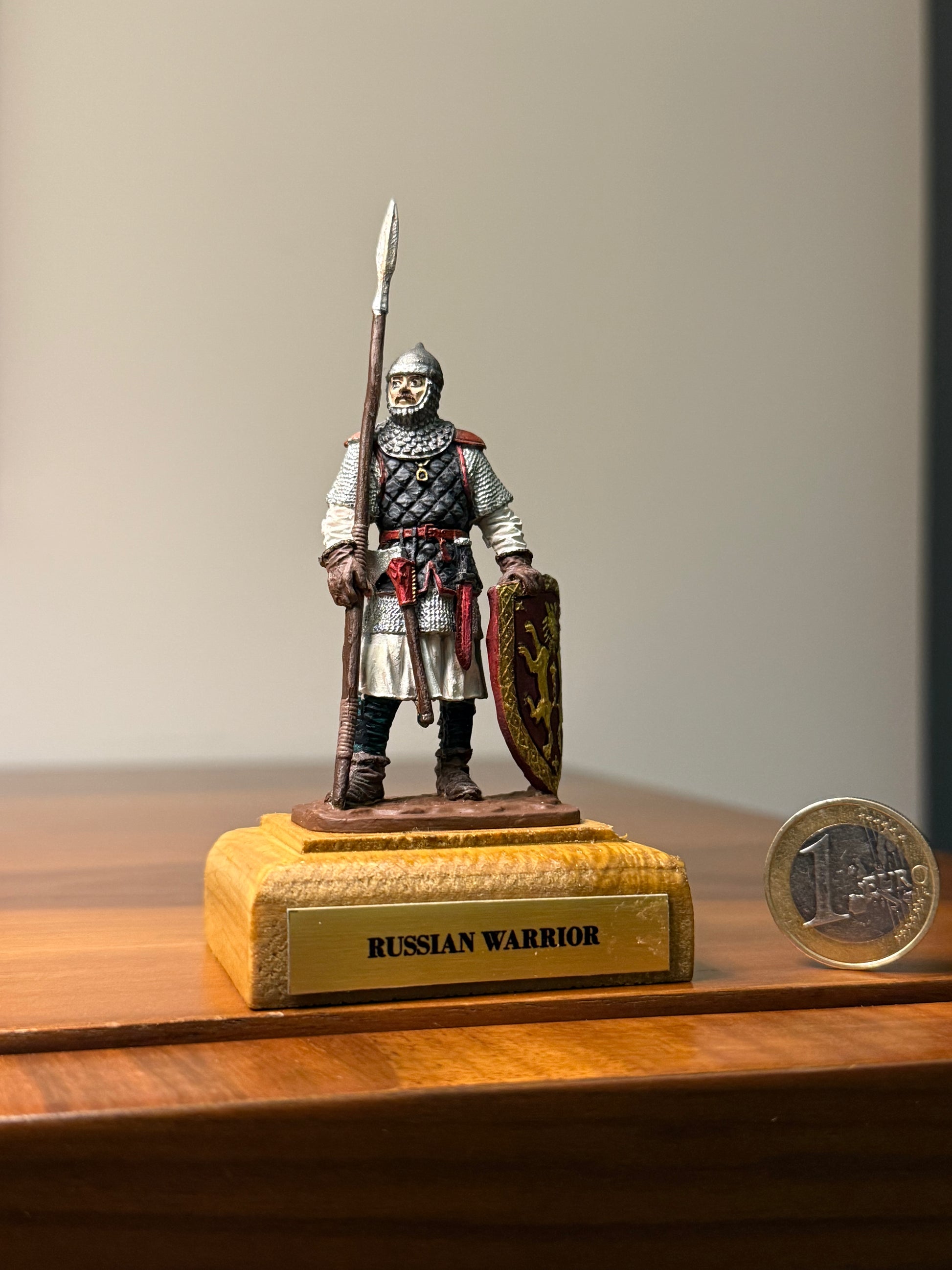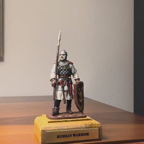 This figure represents a warrior of the Kievan Rus — a medieval East Slavic state that flourished between the 9th and 13th centuries. Influenced by Norse, Byzantine, and Slavic cultural traditions, Kievan Rus warriors were known for their distinct lamellar armor, oval shields, and disciplined battlefield presence.