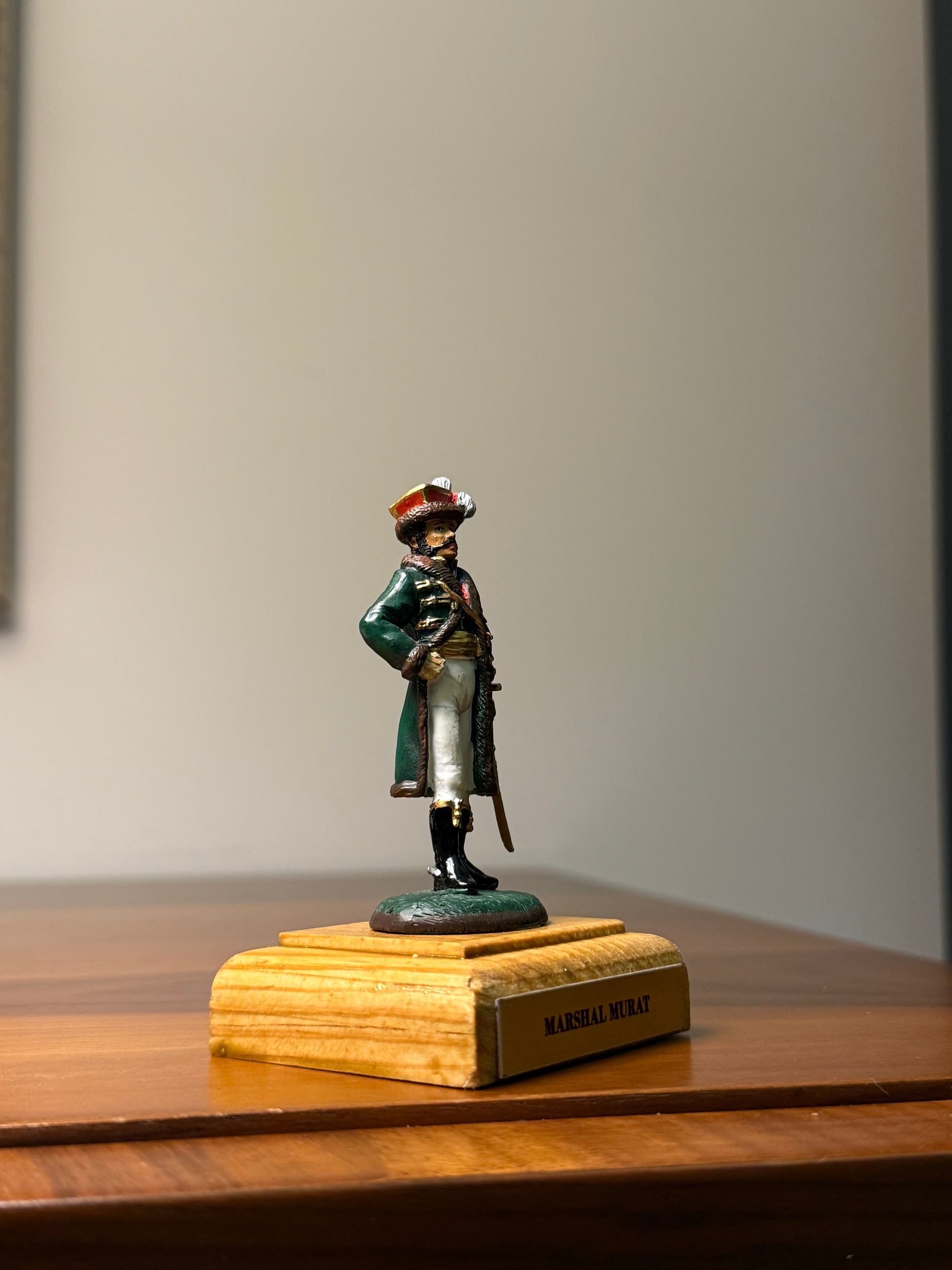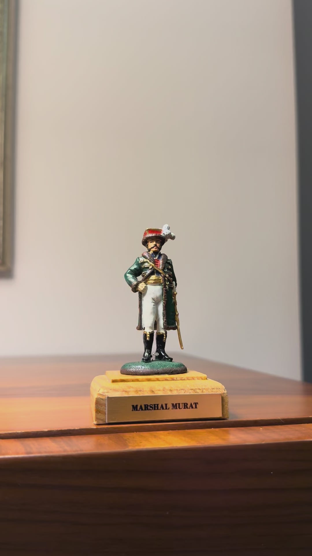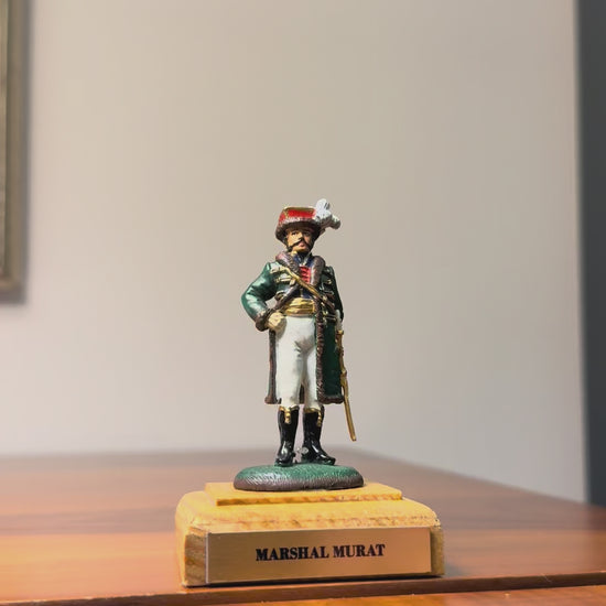 This 54 mm display miniature represents Joachim Murat (1767–1815) — Marshal of the French Empire, King of Naples, and one of the most famous cavalry commanders in European military history. Murat was renowned for his brilliant cavalry charges, dramatic leadership style, and his extravagant, colorful uniforms.