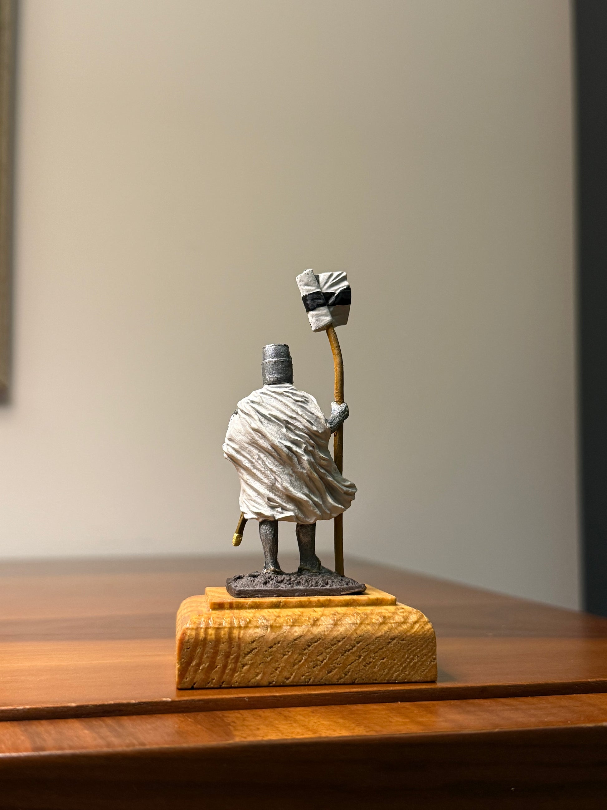 This hand-painted 54 mm miniature depicts a Teutonic Knight, a member of the German military order active during the Crusades and throughout Central & Eastern Europe in the 13th–14th centuries. Known for their discipline, martial skill, and distinctive white surcoats marked with the black cross, the Teutonic Knights played a major role in the politics and warfare of medieval Europe.
