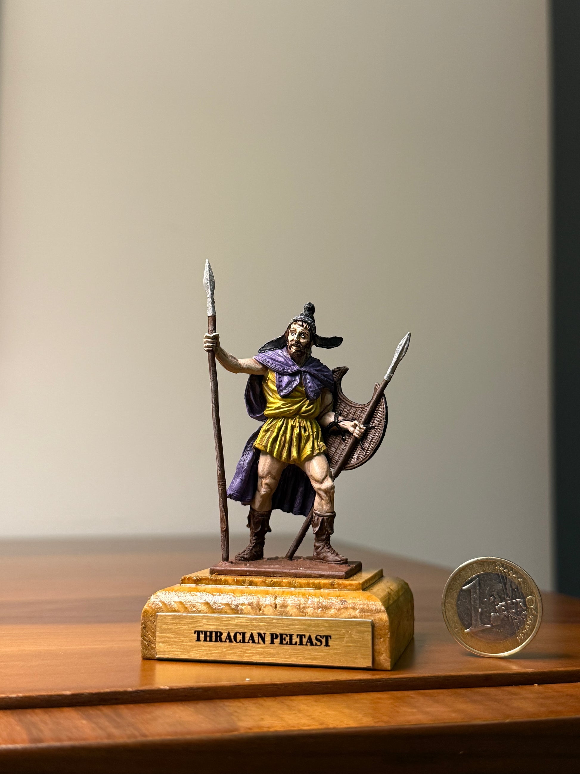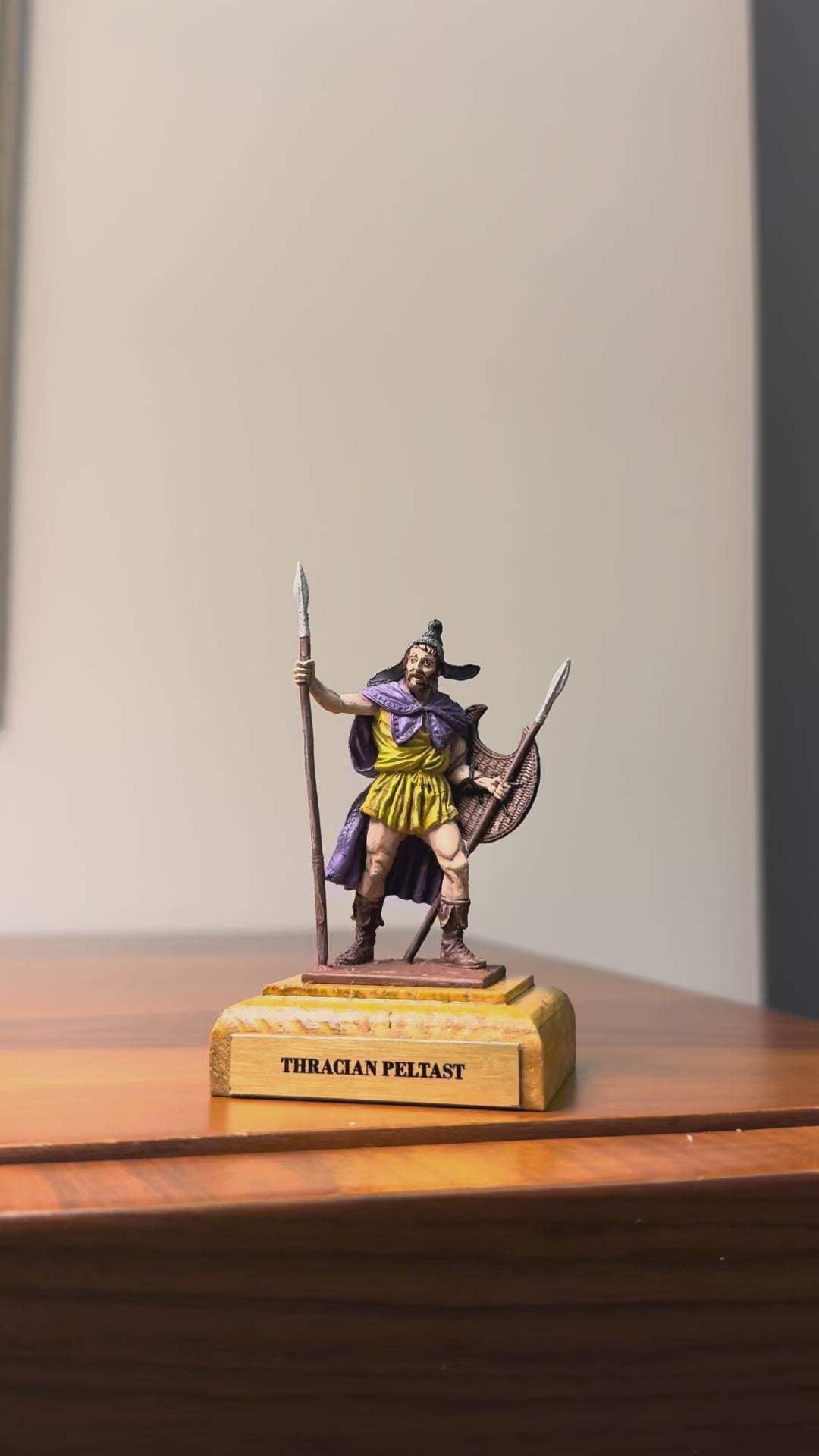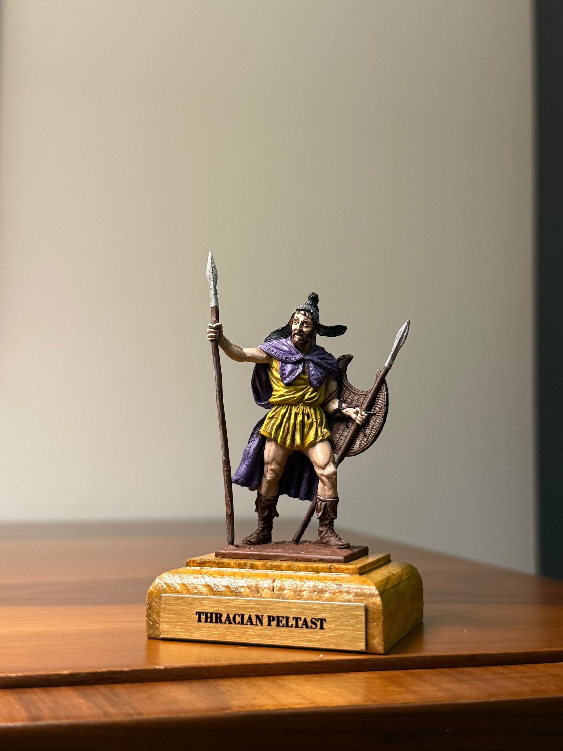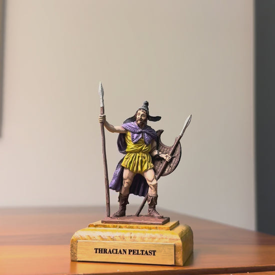 This miniature portrays a Thracian peltast, a light infantry warrior from ancient Thrace. Known for their speed, curved rhomphaia swords, crescent shields (pelte), and distinctive cloaks (zeira), Thracian soldiers were widely respected and recruited as skilled mercenaries throughout Greece and the ancient Mediterranean.